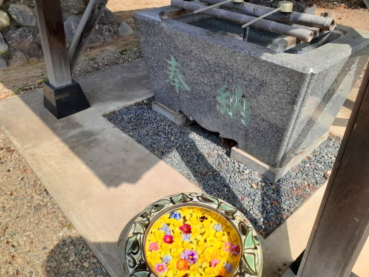 参道途中にある手水舎(写真左)。手水舎脇にちょっとおしゃれな花手水を鑑賞(同右)