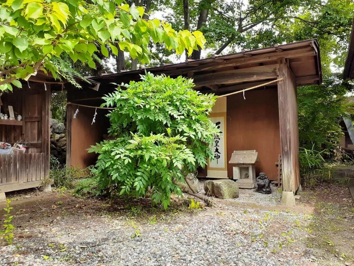 祇園神社・天照大神が祀られている。   石祠は「御神犬」、中央は稲荷社、右は蚕影社