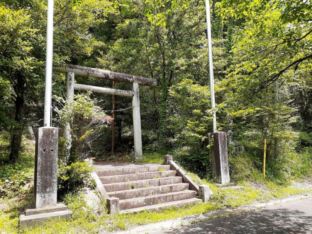 鳥居の右側に立つ社号標柱。左側にあるのは 石段を登り終えるその先に境内、