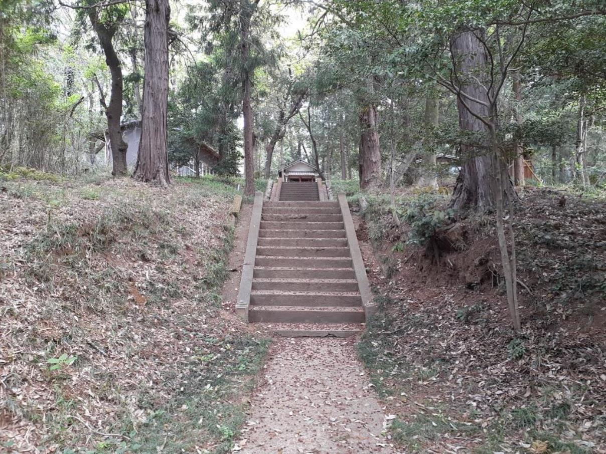 参道の両側には豊かな森林に覆われていて(写真左)、石段上に拝殿が設けられている(同右)。丘陵地面に位置している鳩山町の社は市街地以外はこのような配置となっているものが多い。