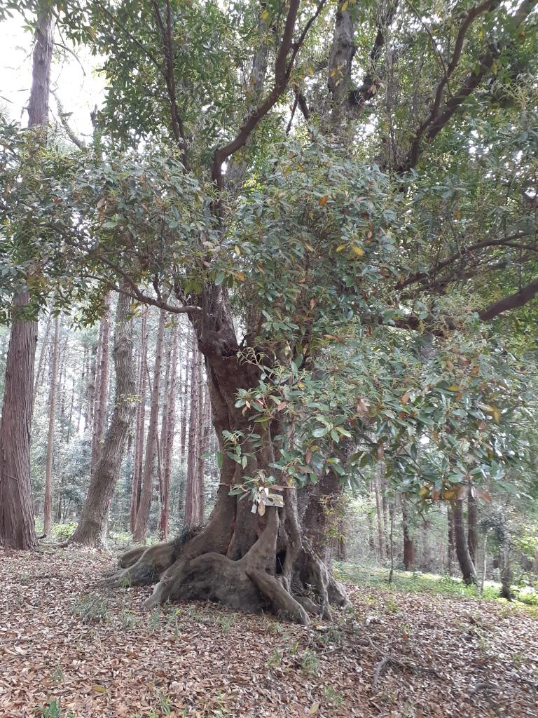参道を進む途中、右側に聳え立つ「鳩山町景観樹木」であるタブノキ。