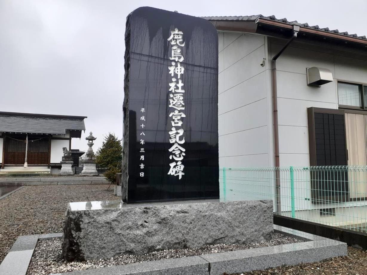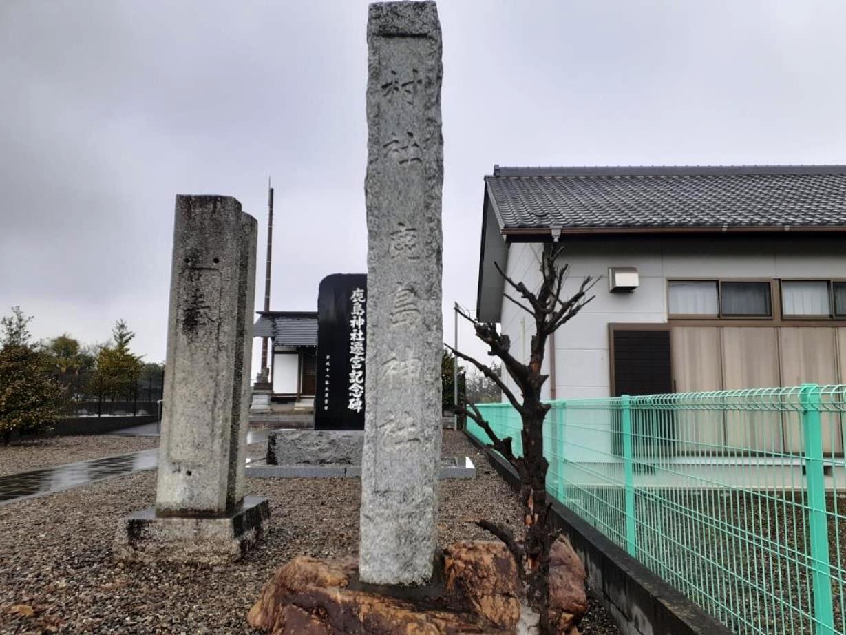 鳥居の右側にある社号標柱 社号標柱の奥に立つ「鹿島神社遷宮記念碑」