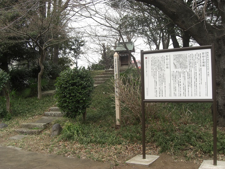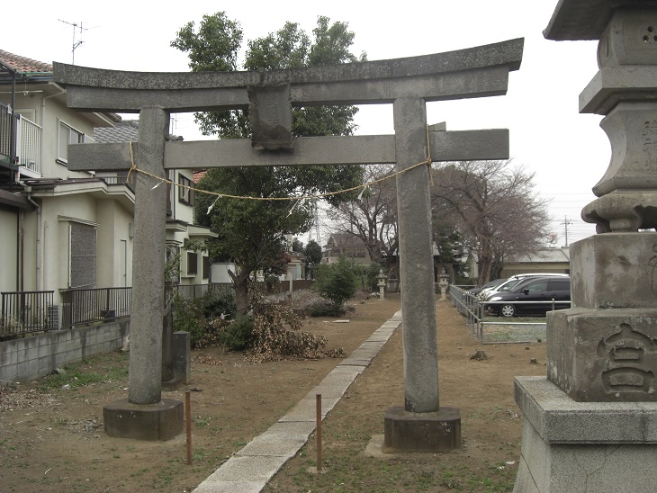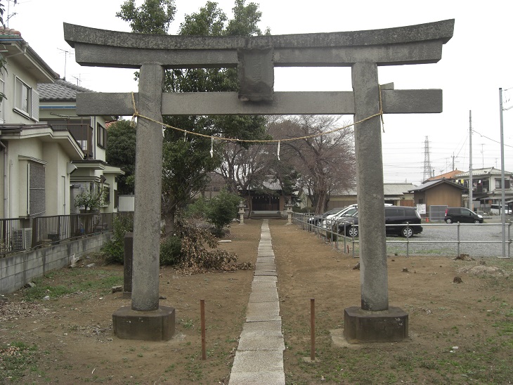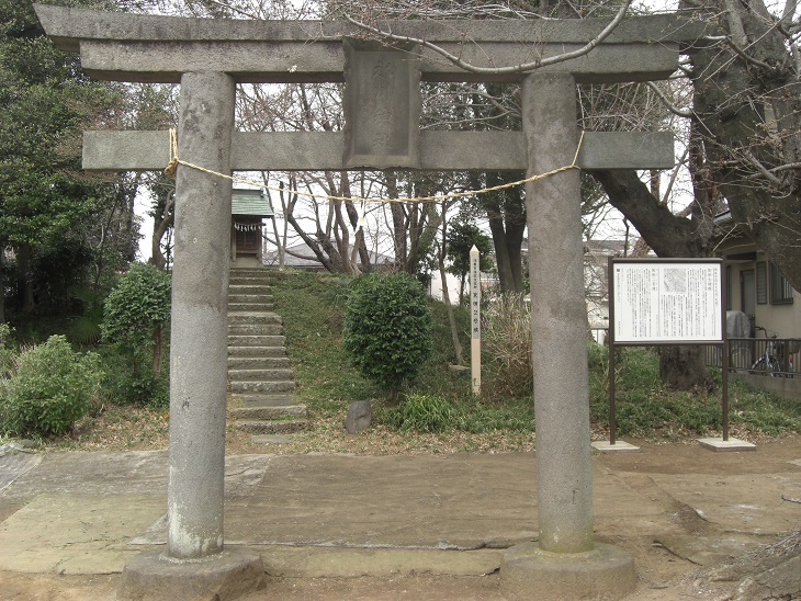 道路沿いにある箕田氷川神社の鳥居 古墳上にある本殿