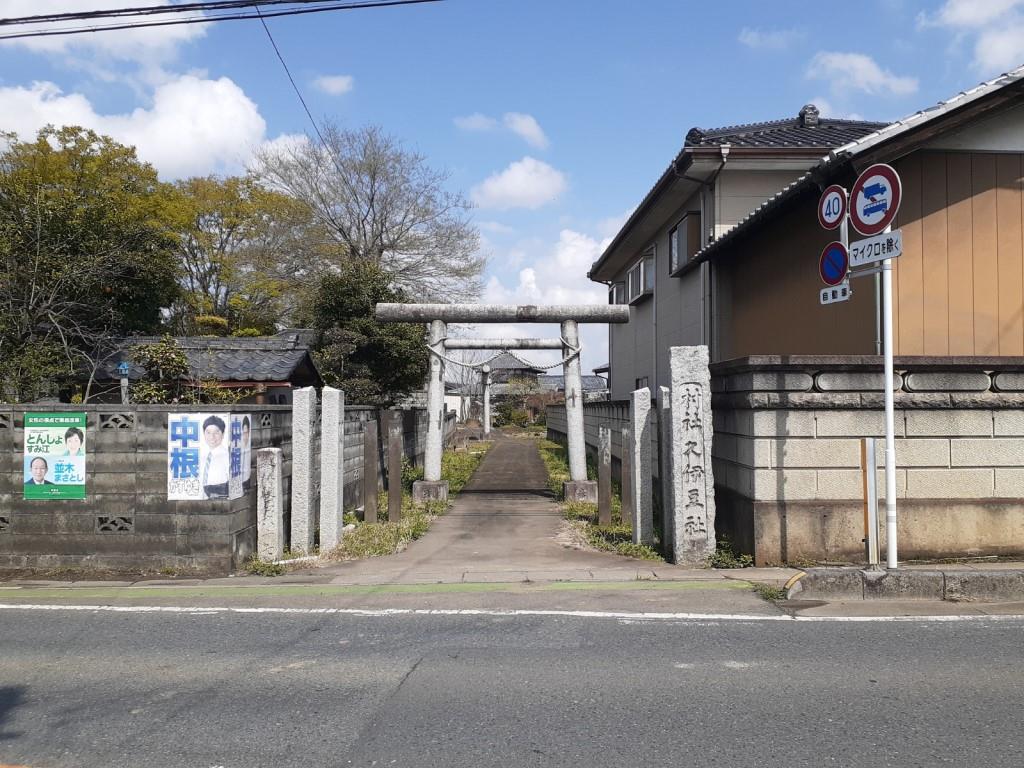 一の鳥居から奥に横を向いた二の鳥居が僅かに見える。この二の鳥居は右側にある民家の塀で正面から撮影できず、斜めからでは参道の幅が狭いため、アングル的に撮影は断念した。