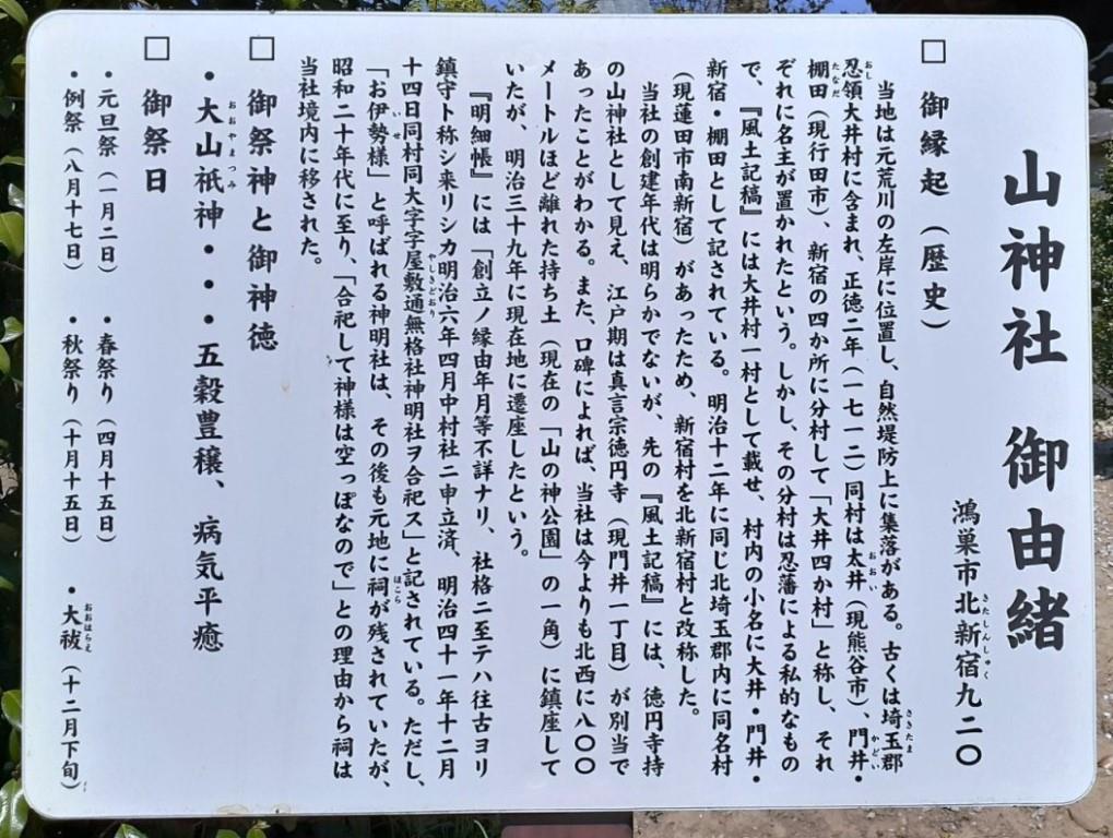残念ながら案内板には「山神」と北新宿地域との直接的に関連する文面はないため、勧請した経緯は分からない。
