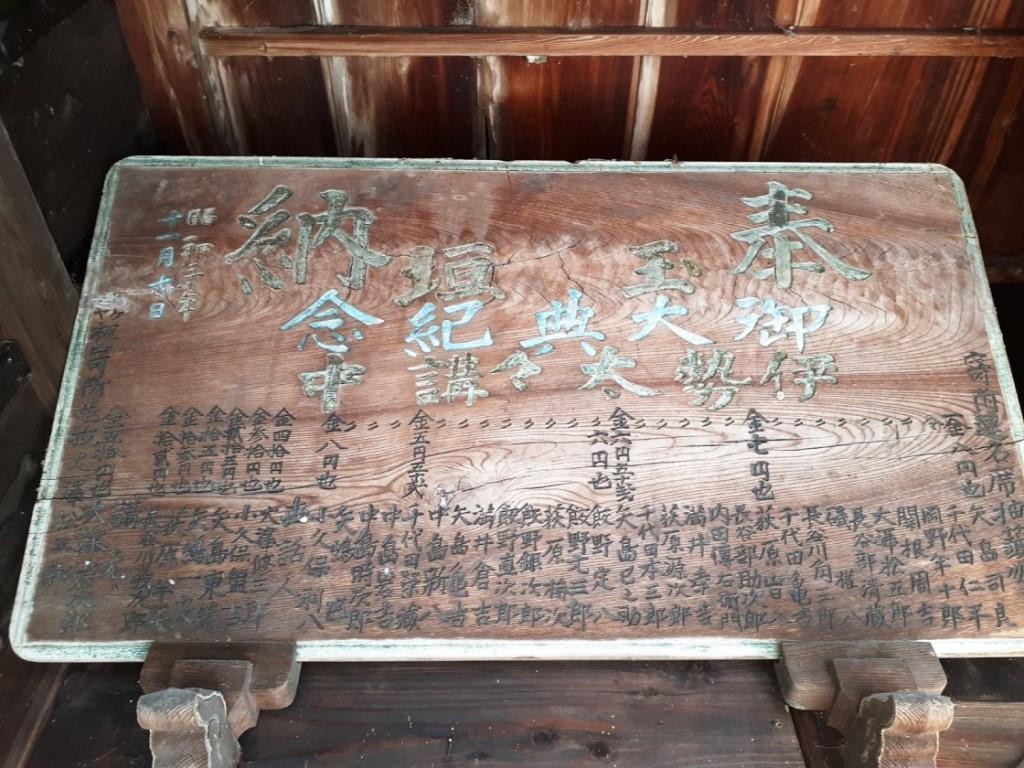 拝殿に掲げてある扁額「山神大明神」と表記  拝殿左側には「浅間大神」と刻まれた石碑あり