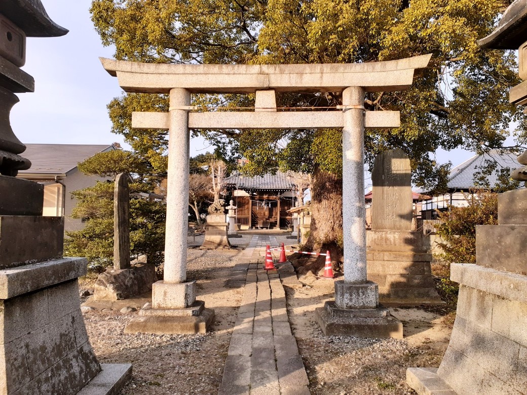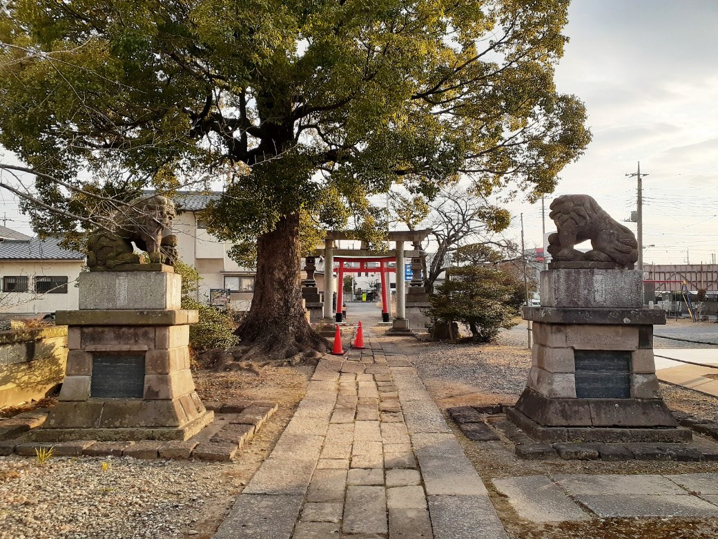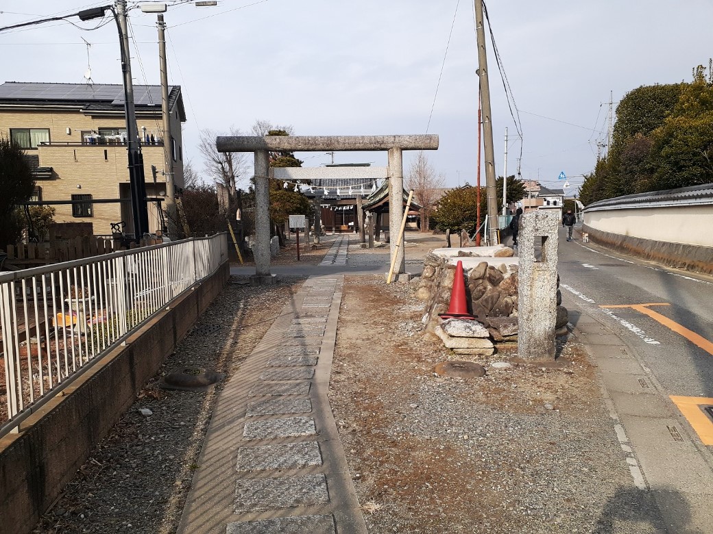 一の鳥居は進行道路に対して正面に見えるのだが、道路は鳥居付近で西側に折れ曲がり、境内の参道は当初は真っ直ぐ進むが、すぐに突き当たりとなり、そこを左方向に曲がる。すると正面に二の鳥居、そこから続く高台の頂に社殿が鎮座する特異な配置となっている。