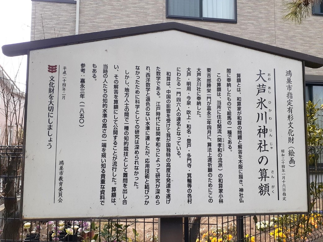 和算は、中国の影響を受けて我が国独特の高度な発達を遂げた数学である。江戸時代には関孝和らによって研究が深められ、西洋数学と遜色のない水準に達したが、応用技術と結びつかなかったために科学としての研究は深められなかった。しかし、地方人士の間で一種の知的競技として難問を出し合いその解答を算額にして公開することが流行した。算額は、当時の人たちの知的水準の高さの一端を窺い知る貴重な資料でもある。 参考:大正四年(一九一五)