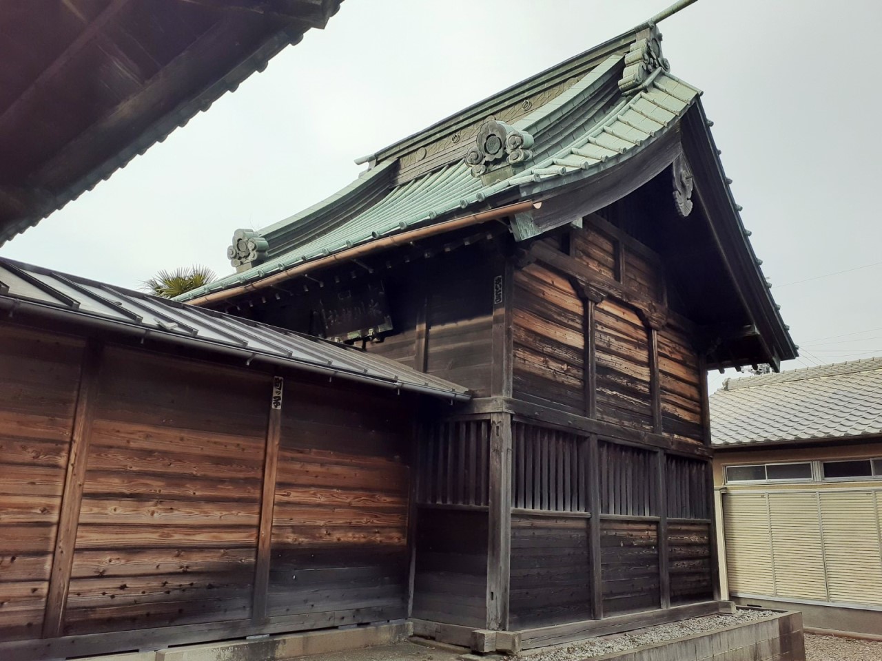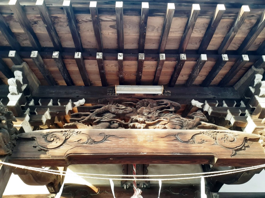 社自体かなり老朽化が進んでいるのだろうか。所々に「筋交い」で補強されている。この「筋交い」とは、柱と柱の間に斜めに入れて建築物や足場の構造を補強する部材である。構造体の耐震性を強める効果があり、地震や暴風などの水平力を受けたときに平行四辺形にひしゃげるように変形してしまう。そこで、対角線状に筋交いを加えて三角形の構造を作り、変形を防止する効果がある。