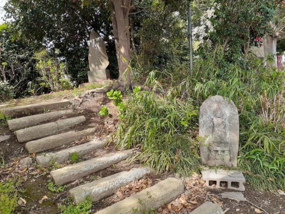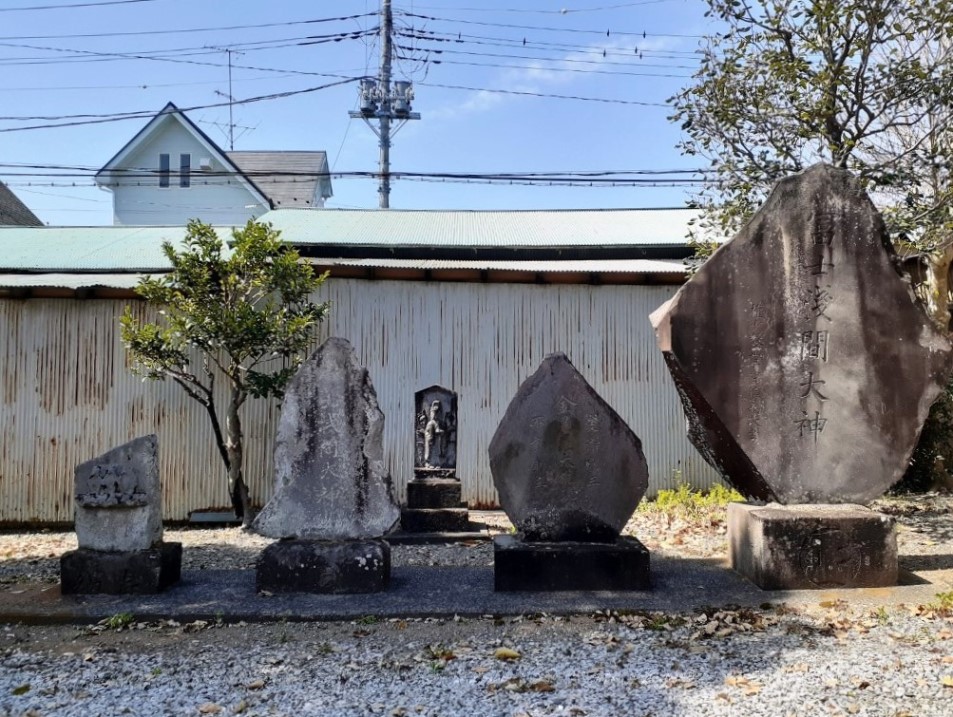 石碑群は左から三猿庚申塔、冨士浅間大神、不動明王・金毘羅大権現・愛染明王、冨士浅間大神。並びの後ろのある石像もあるが名称は不明。