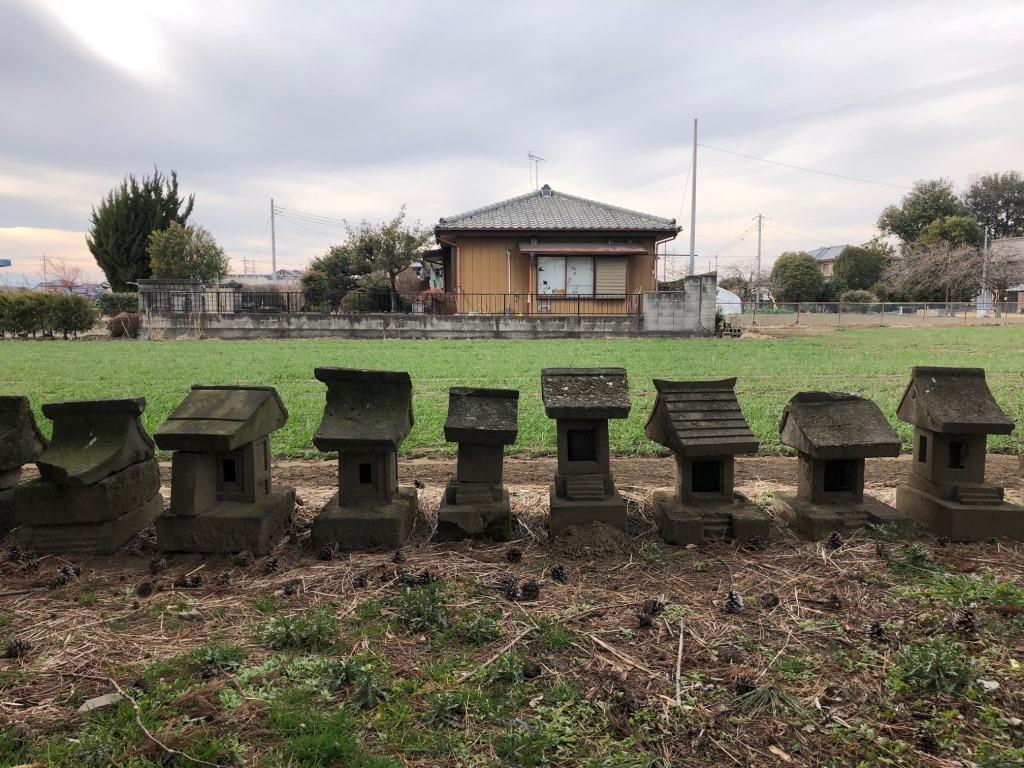 社殿の西側から北西部にかけて祀られている石祠群(写真左)と、庚申塔群(同右)