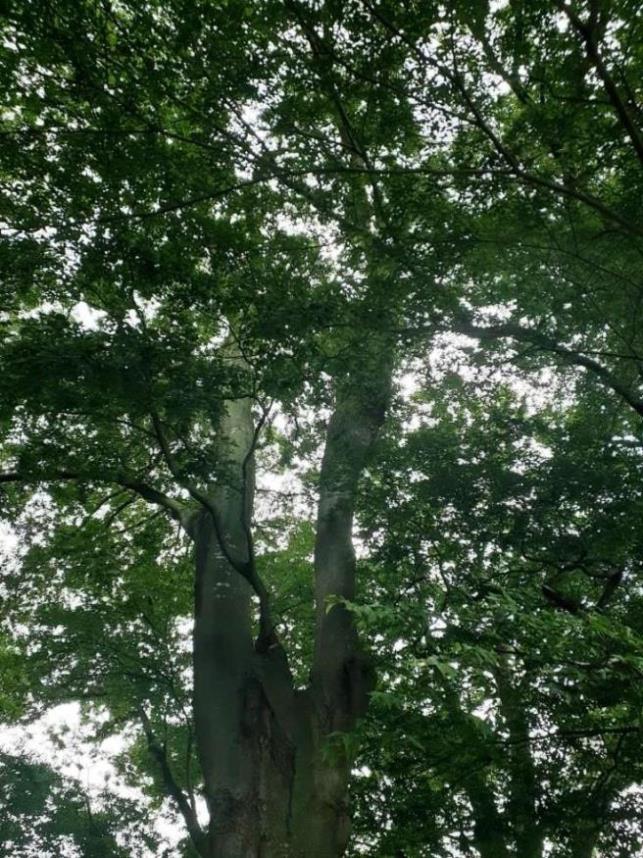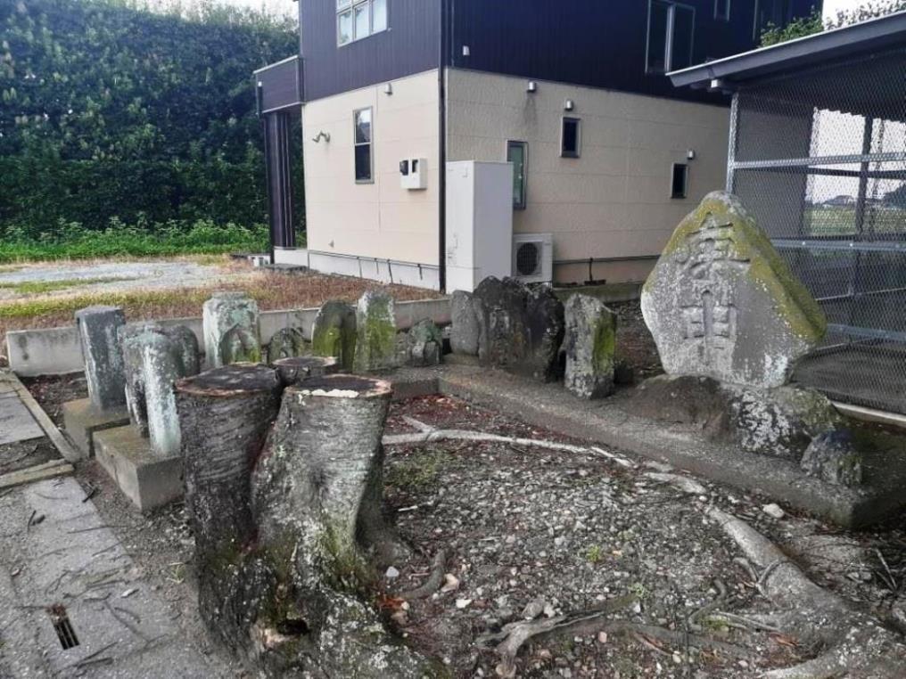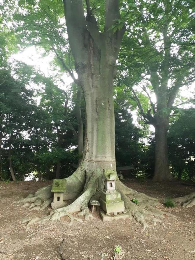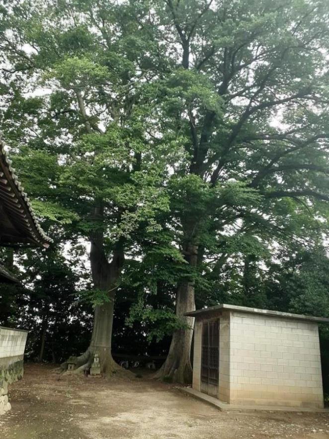 ご神木(写真左・右)とその幹部分に祀られている寛永4年(1627)銘をもつ石祠。