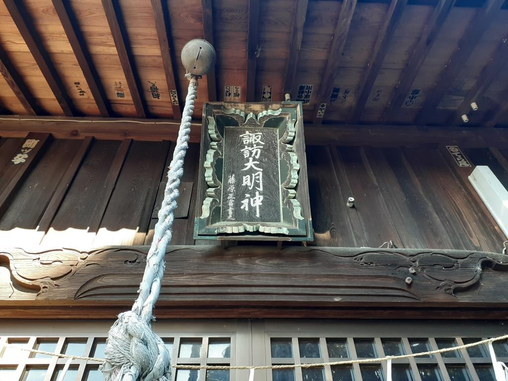 口碑によると、栢間村西部に陣屋を構えた際に、その敷地内に氏神として、諏訪神社と稲荷神社の二社を祀ったとされ、このうちの諏訪神社が当社であるという。