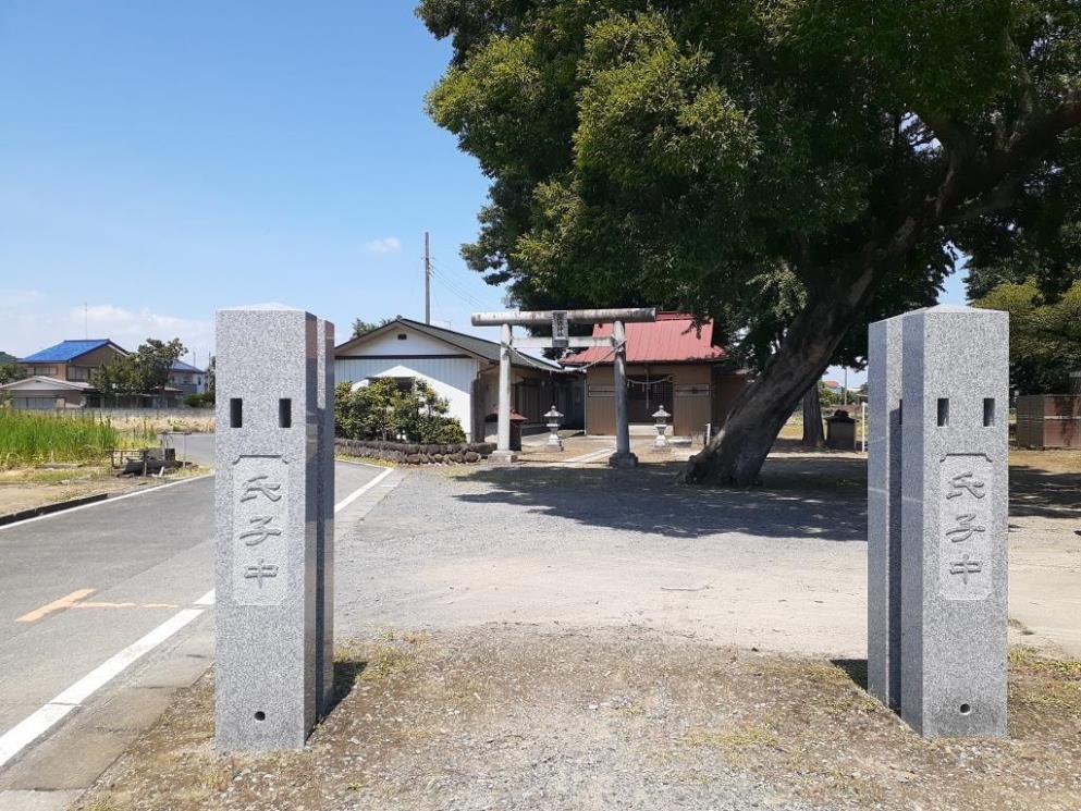 社の正面となる社号幟を立てる柱から見ると、鳥居はやや西向きとなっている。