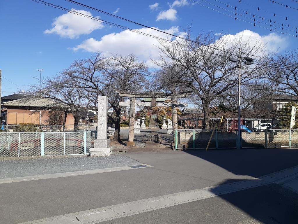 菖蒲神社から埼玉県道5号さいたま菖蒲線を450m程南下し、細い路地を左折すると、すぐ進行方向左手に菖蒲町三箇神社が見えてくる。街中の住宅街に鎮座する社。