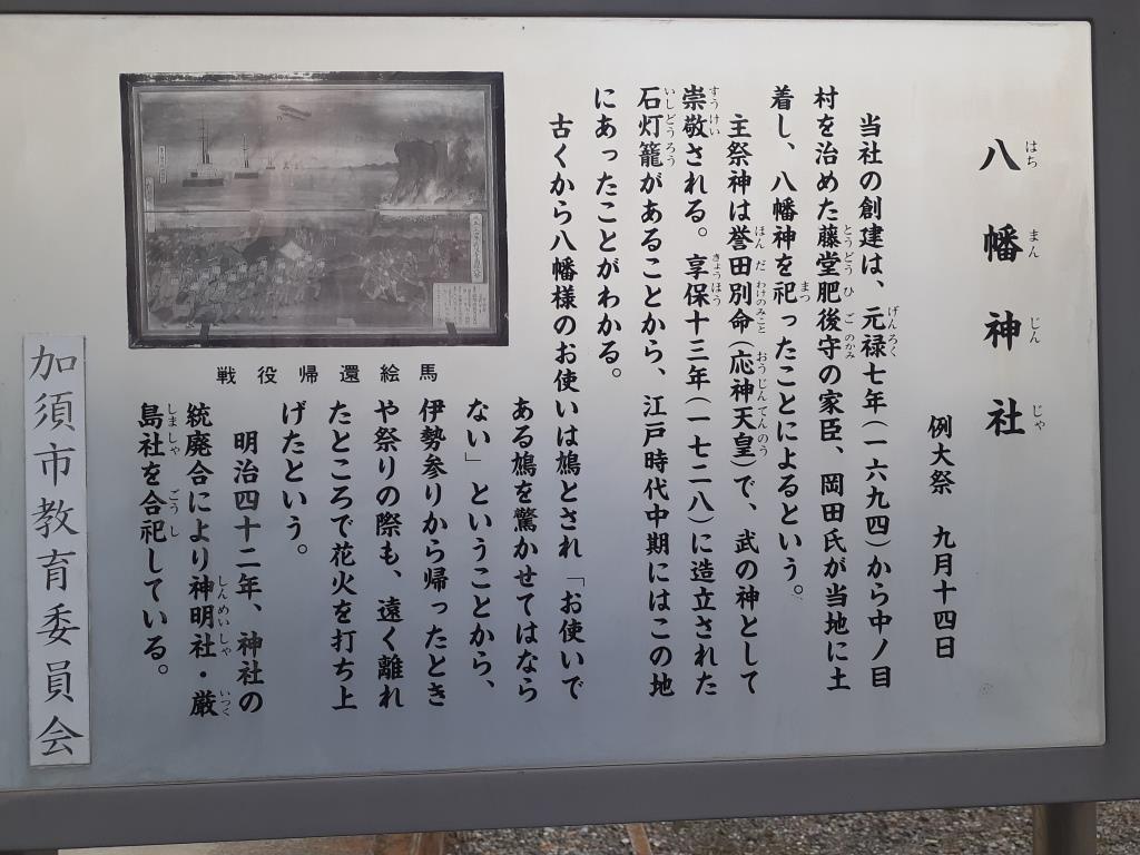 案内版にも記述されているのだが、八幡様は古くから「花火が嫌いな神様」といわれ、他の所で打ち上げても当社では決して行ってはならないとの禁忌がある。伊勢参りの下山祝いには、その都度花火が打ち上げられたが、この時も神社から離れた田を使っている。この禁忌は、八幡様の神使である鳩を花火の音で驚かせてはならないとすることから起こったという。