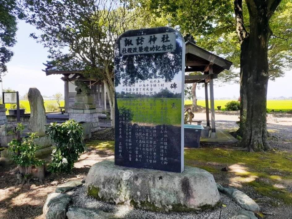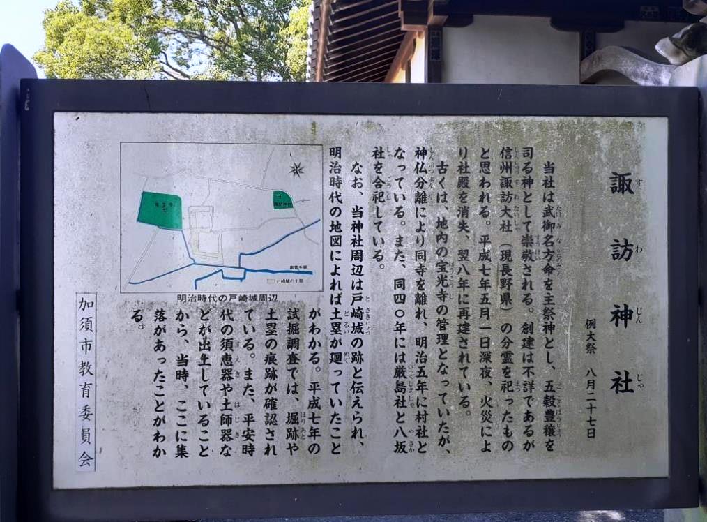 当神社は古来、戸崎の里の総鎮守としてこの地に鎮座し、武御名方命を祀る。村人の幸福と五穀豊穣を恵む、その神徳は遍く広く厚きものあり。