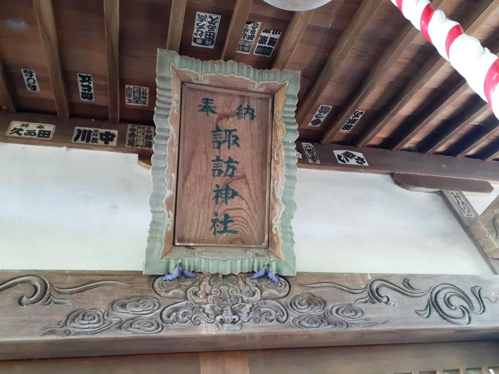 写真には見えずらいが、拝殿前にある賽銭箱に刻まれている神紋は「違い鎌」という。俗にいう鎌紋とは、農具として使われる鎌をモチーフとした家紋。鎌は諏訪明神の御神体で、祭具として崇められ、また豊穣を祈る意味を持つことから信仰的な意義により家紋となったという。