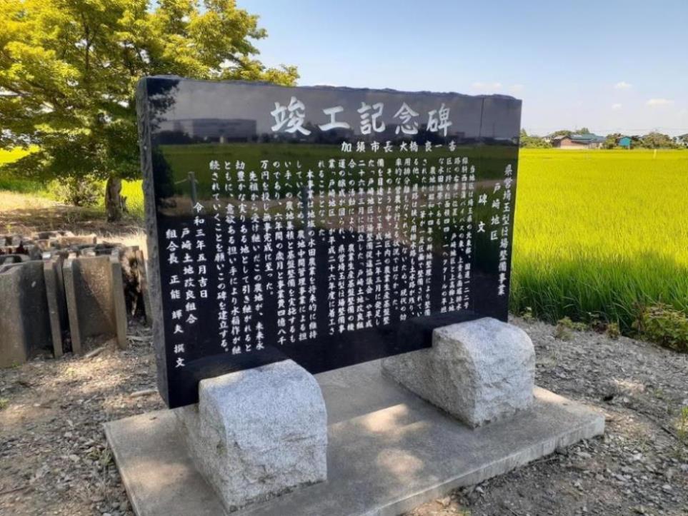 記念碑文によると、戸崎地域周辺は平坦な水田地域で、農地自体は、昭和14年の耕地整理により整備されてはいるが、一反区画で整備されているほか、道路は狭く用排水路も土水路が残っていて、用排分離もされていないため、効率的な営農が行える状態ではなかったといい、そこで、平成26年度に戸崎地区周辺一帯の整備事業が行われたとの事だ。