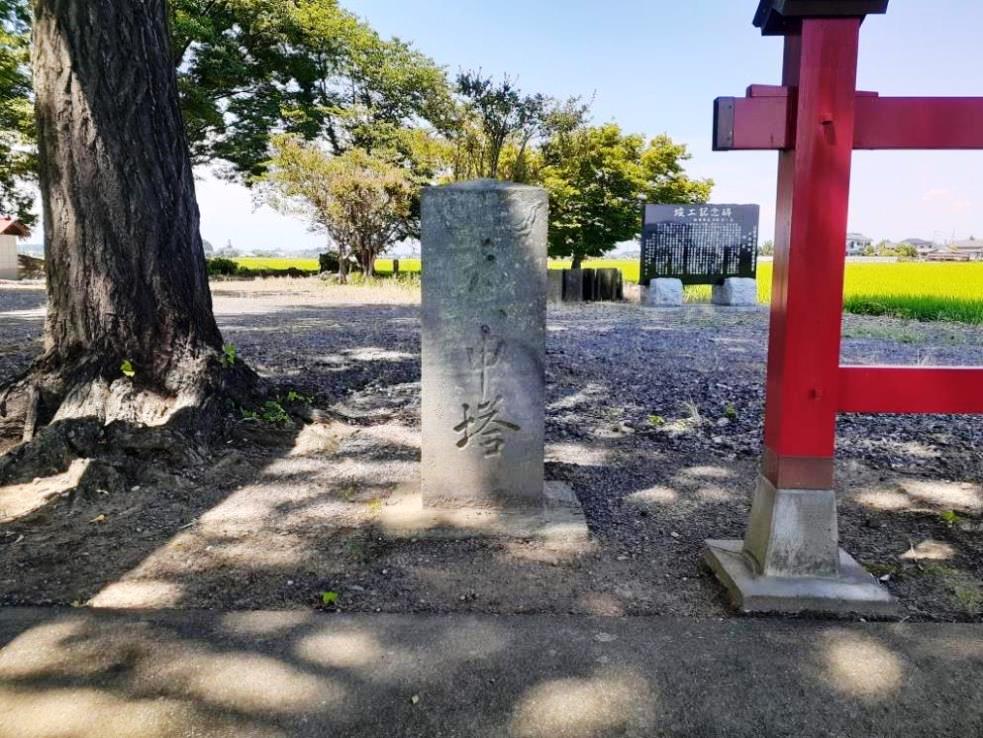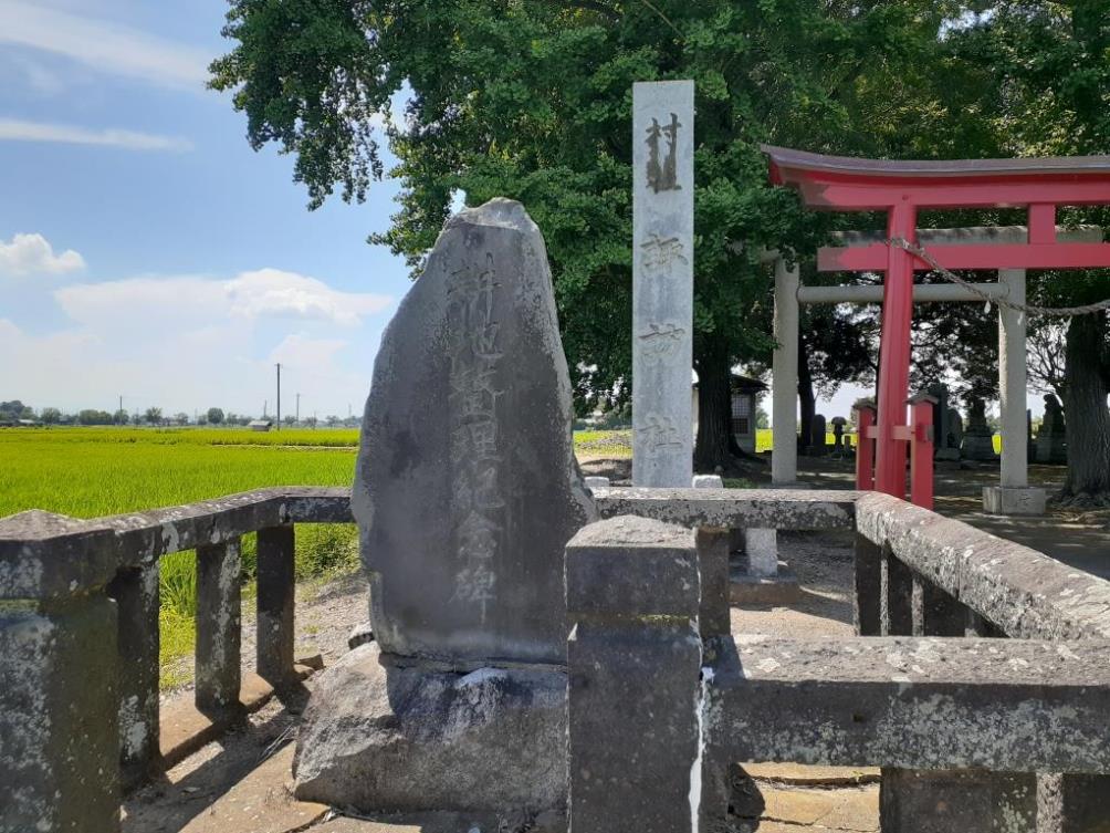 鳥居近くに建つ「耕地整理記念碑」 境内にある「県営埼玉型ほ場整備事業の竣工記念碑」