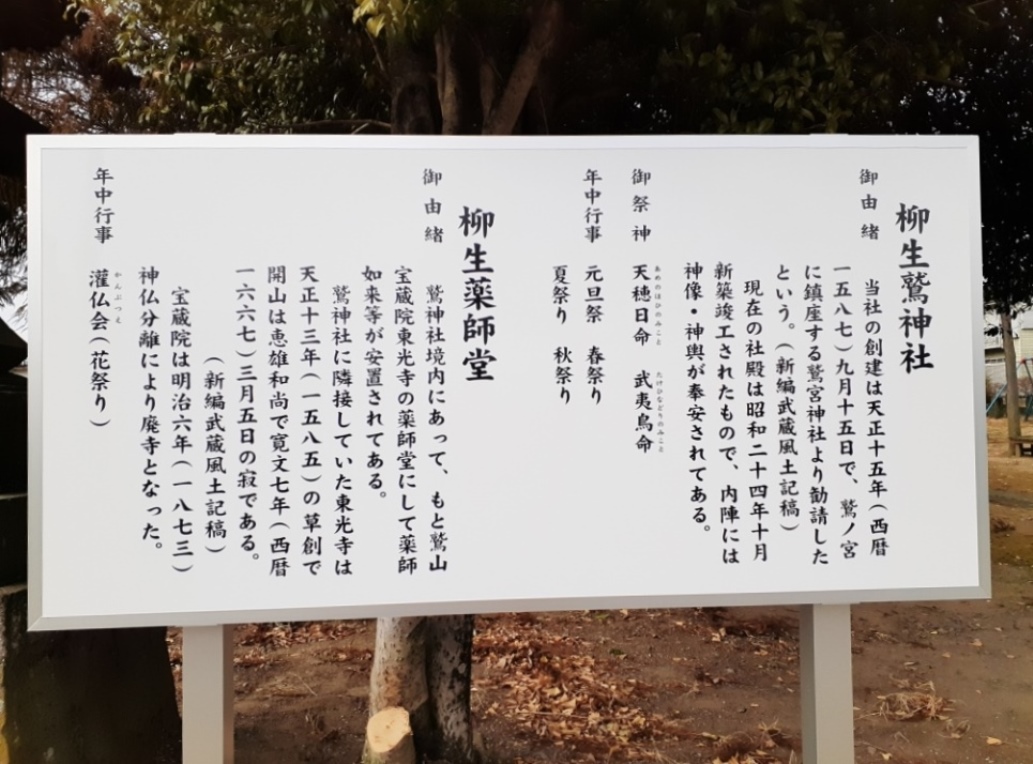 案内板によると、柳生鷲神社の創建は天正15年(1587)9月15日で、鷲ノ宮に鎮座する鷲宮神社より勧請したという。現在の社殿は昭和24年10月新築・竣工されたもので、内陣には神像・神輿が奉安されているという。また柳生薬師堂は、鷲神社内にあり、もと鷲山宝蔵院東光寺の薬師堂にて薬師如来が安置されている。鷲神社二隣接していた東光寺は、天正13年(1585)の草創で、開山は恵雄和尚で、寛文七年(1667)3月5日寂した。なお、宝蔵院は明治6年(1873)神仏分離により廃寺となったという。