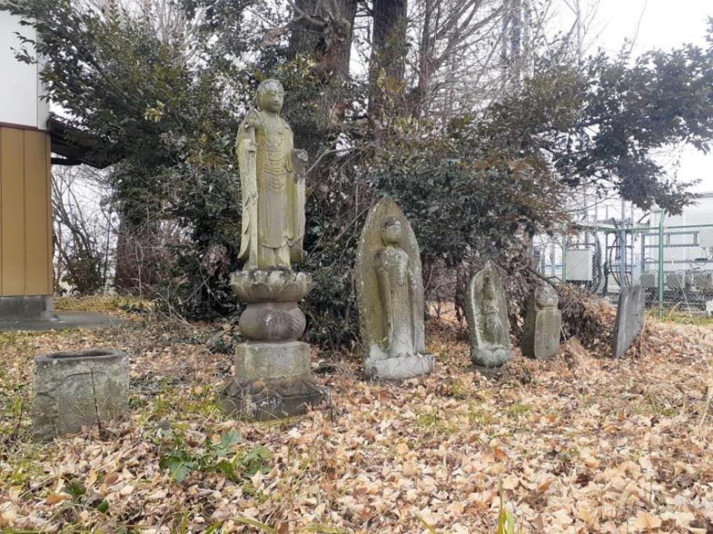 拝殿手前左側にある「青面金剛像」 「青面金剛像」の右側に並ぶ菩薩像等