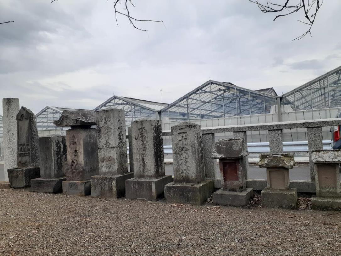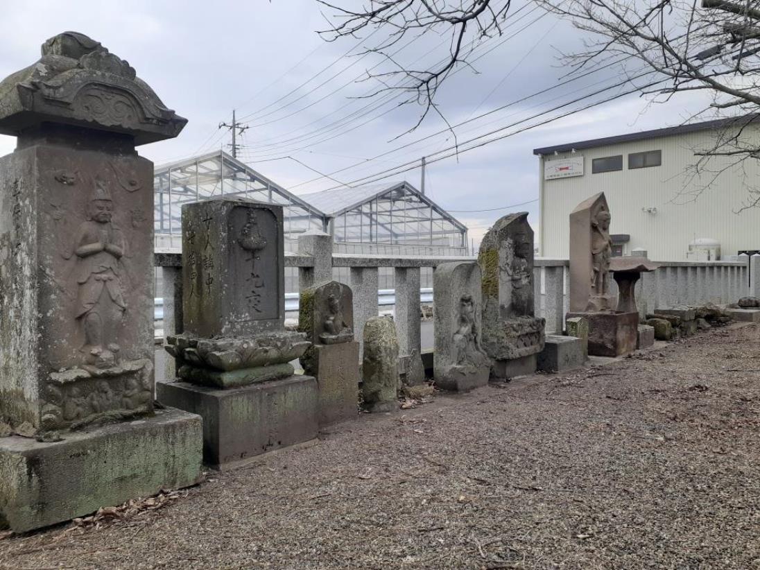 境内北側の道路沿いには石碑・石祠群が横一列に並んで祀られている。