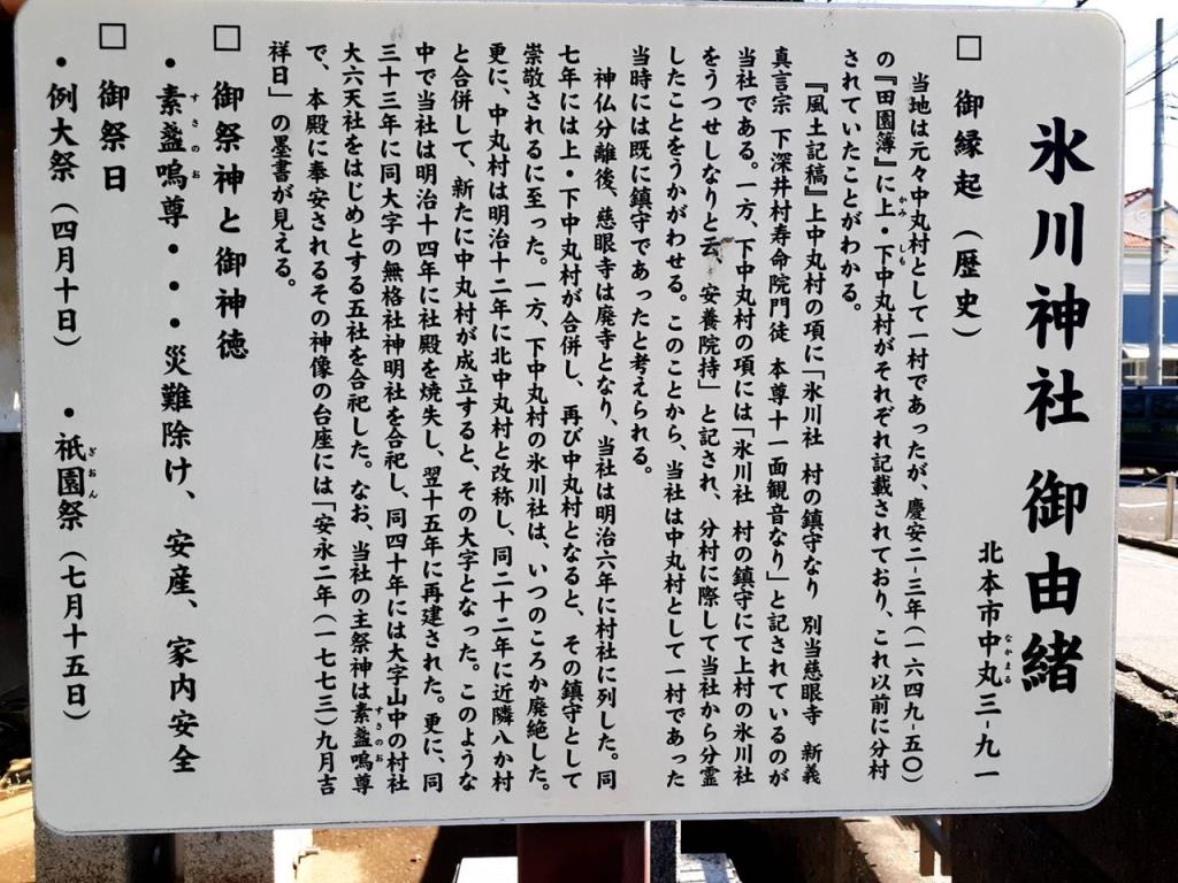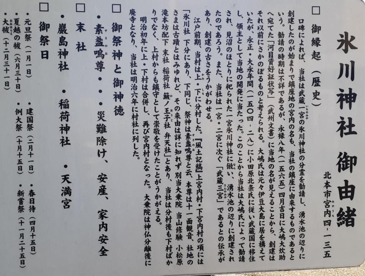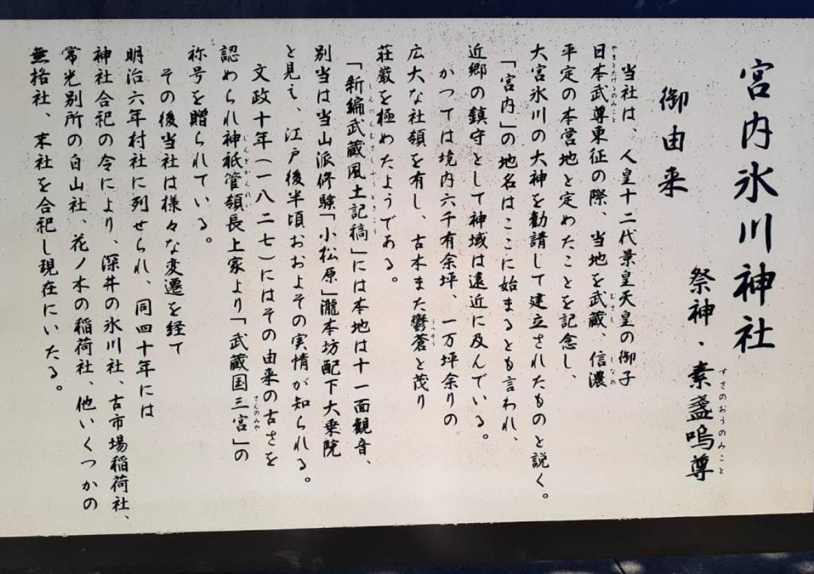 当社は、人皇十二代景行天皇の御子日本武尊東征の際、当地を武蔵、信濃平定の本営地と定めたことを記念し、大宮氷川の大神を勧請して建立されたものと説く。「宮内」の地名はここに始まるとも言われ、近郷の鎮守として神域は遠近に及んでいる。