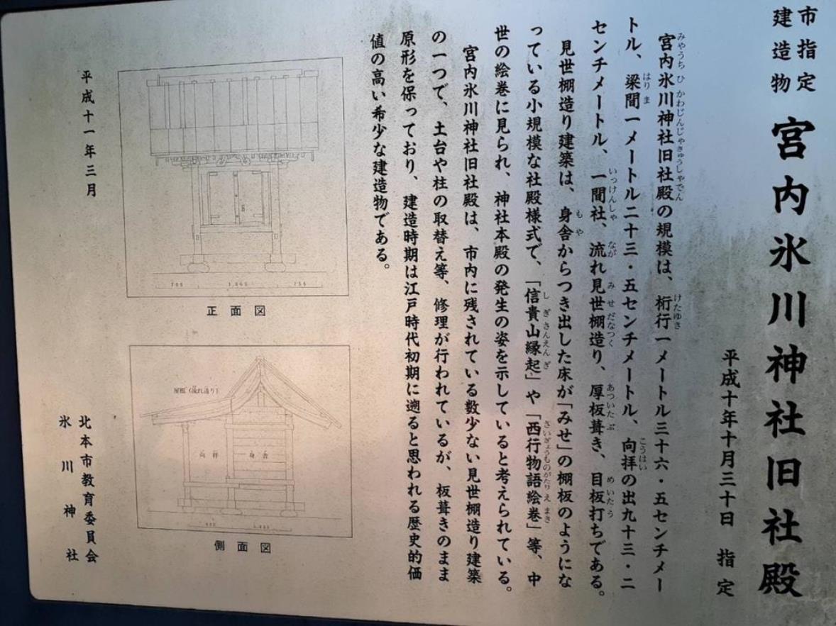 宮内氷川神社旧社殿は、市内に残されている数少ない見世棚造り建築の一つで、土台や柱の取替え等、修理が行われているが、板葺きのまま原形を保っており、建造時期は江戸時代初期に遡ると思われる歴史的価値の高い希少な建造物である。
