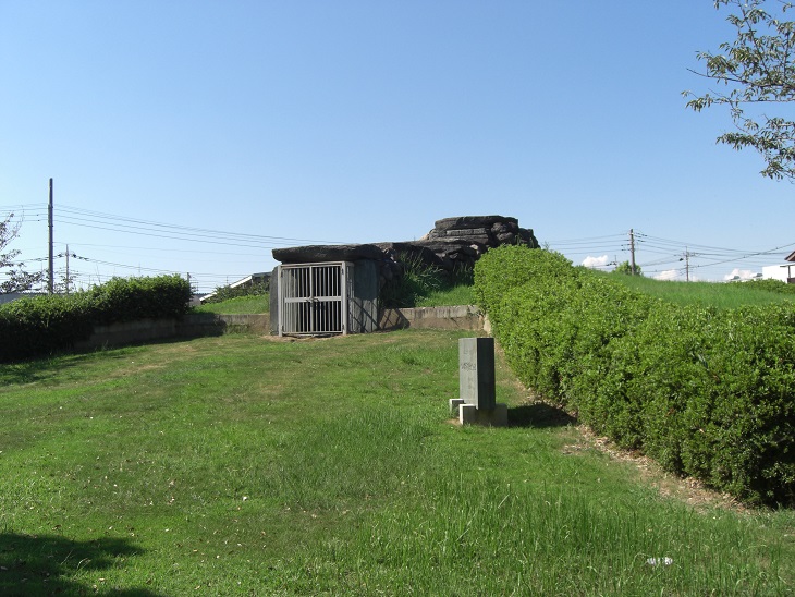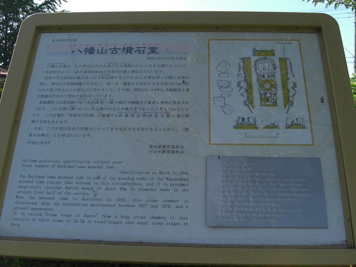 八幡山古墳は埼玉古墳群の北北東方向にあり、距離にして2km位の位置し、工業団地内の八幡山公園内にある。正直古墳の周りは工場と民家で囲まれて、あまりの不釣り合いなコントラストにびっくりした。しかしこの石室には圧倒的な存在感があり、一見の価値がある。ちなみに八幡山古墳の名称は、江戸時代から石室内に八幡社を祀ってきたことに由来する。