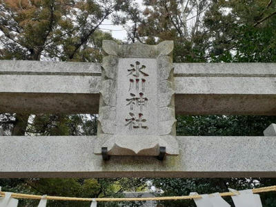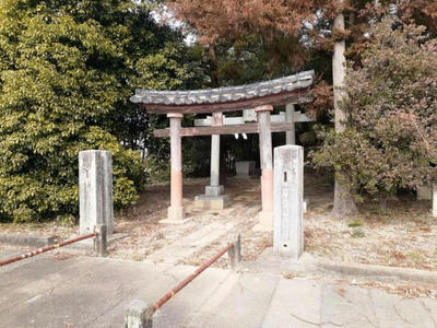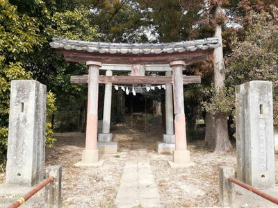 一の鳥居のすぐ先には石製の二の鳥居がある。 二の鳥居の上部にある社号額