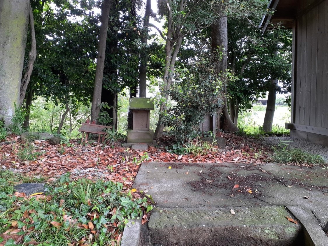 鎮座地は盛り土によってか、自然堤防的なものによるものか、正面社殿及び右側の境内社・荒神社が鎮座するL字状の場所のみ高台となっている。