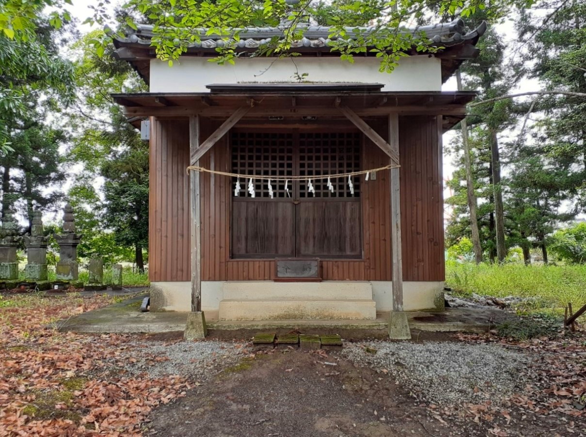 東側には標高22m程の微高地から下る位置に鎮座しており、鎮座地の標高は15mとやや低めだが、東側以外の周囲の田圃地域よりはいくらか高い場所にあると思われる。