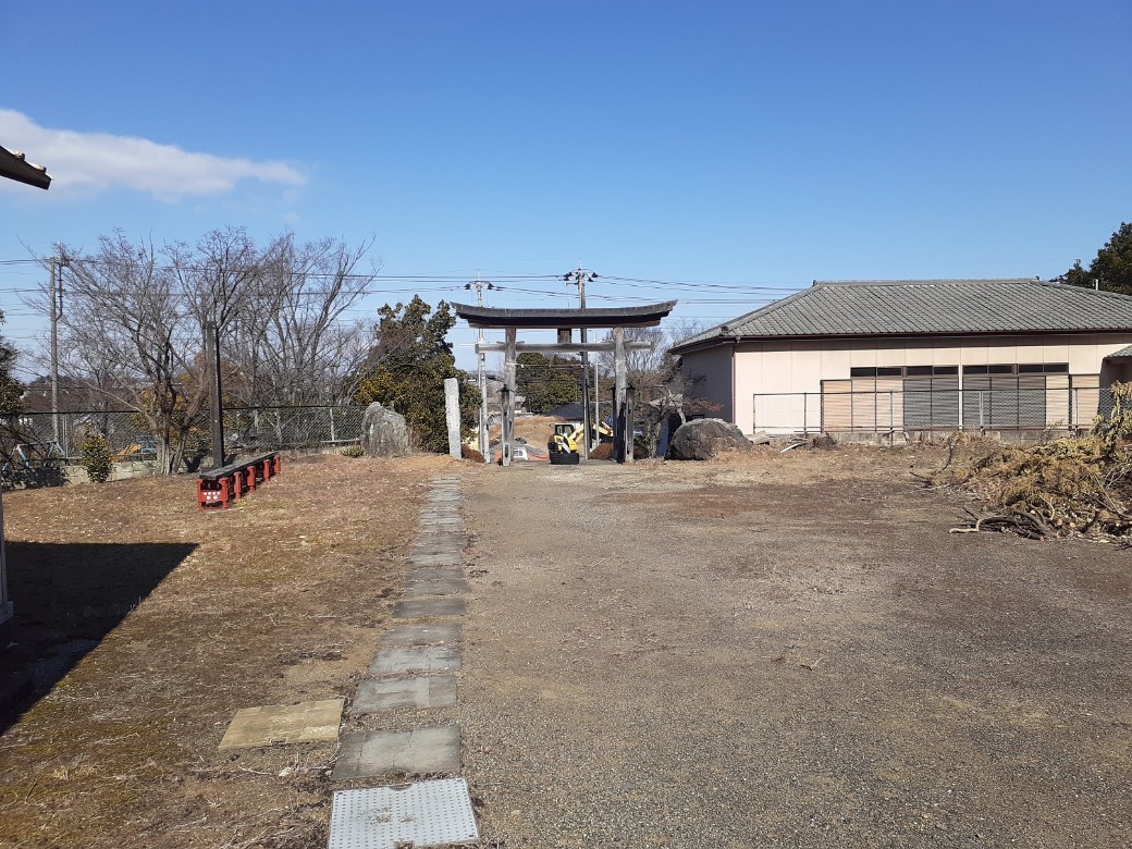 しかし、昭和四十年代に入ると、関越自動車道久喜インター建設のための採土がこの山の周囲で行われたことから、参道の各所に崩れが生じ、参詣に支障を来すようになった。このために社殿等の移転を余儀なくされ、山麓に新たな社地を選定し、昭和四十七年四月十五日に遷座祭を執り行った。山頂にあった社殿をはじめ石造物などもすべて新たな社地にそのまま移し、更に参道の一一一段の石段は、神徳の更なる興隆を願って社殿の基礎に使用した。
