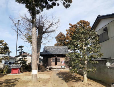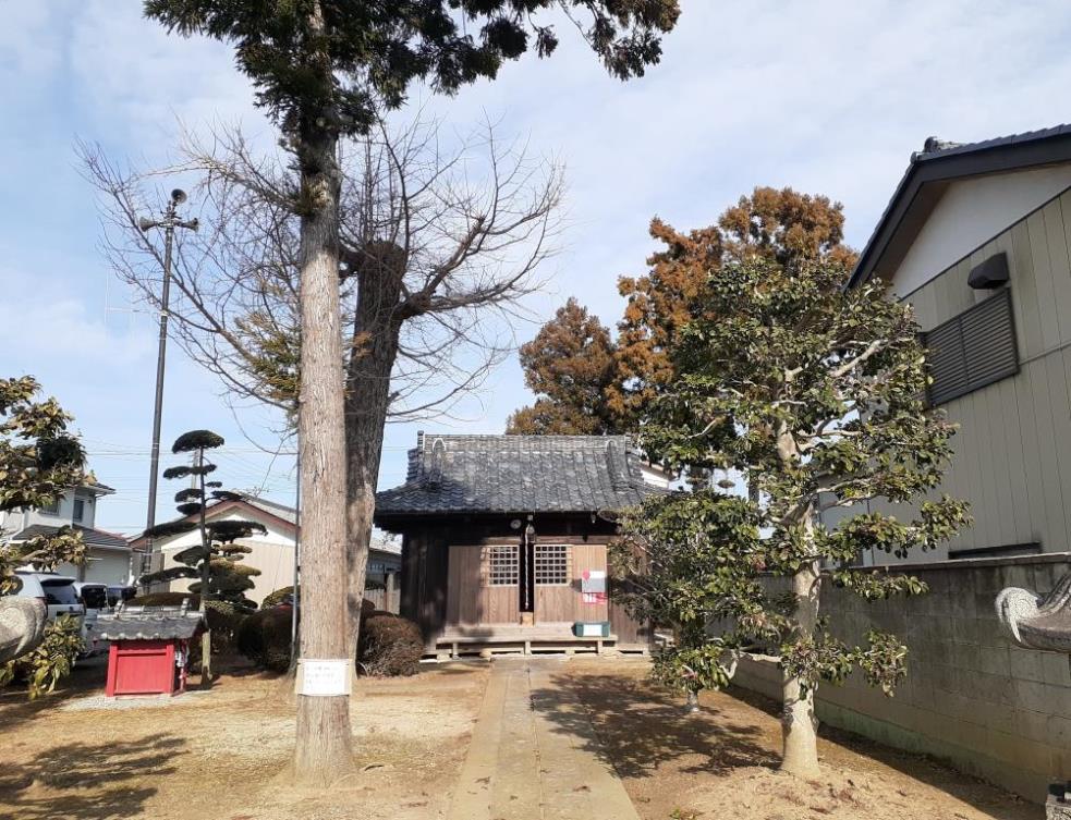 宮代町中島地域は、町東部に位置し、大落古利根川右岸の周囲一帯長閑な田畑風景が広がる地域で、地形を確認すると、大落古利根川のすぐ南側で河川に沿うように細長く形成されている微高地に集落は集中していて、社もその集落内に鎮座している。