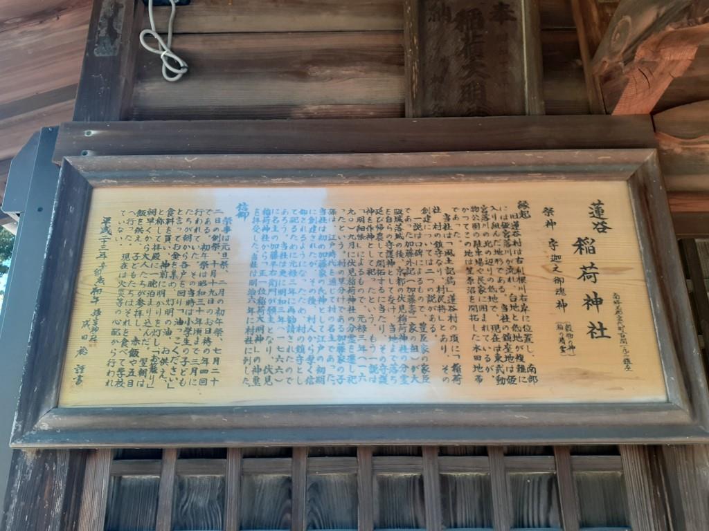当社は「風土記稿」蓮谷村の項に「稲荷社 村の鎮守なり、村民持」とあり、その創建については二つの説がある。