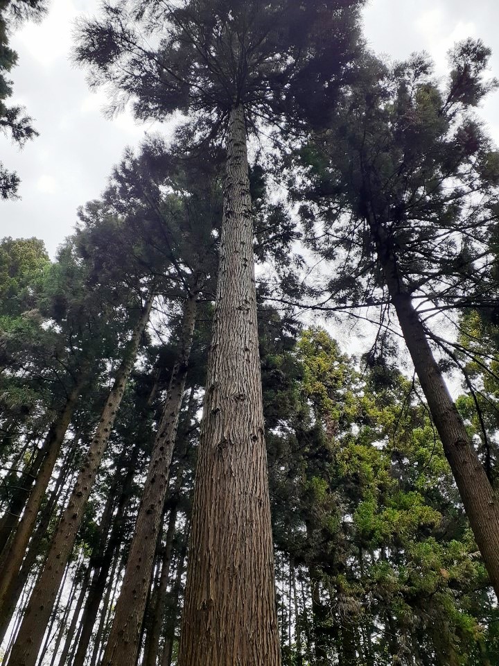 巨石の間から聳えたつ大杉のご神木(写真左・右)。こちらには紙垂がしっかりと巻かれている。