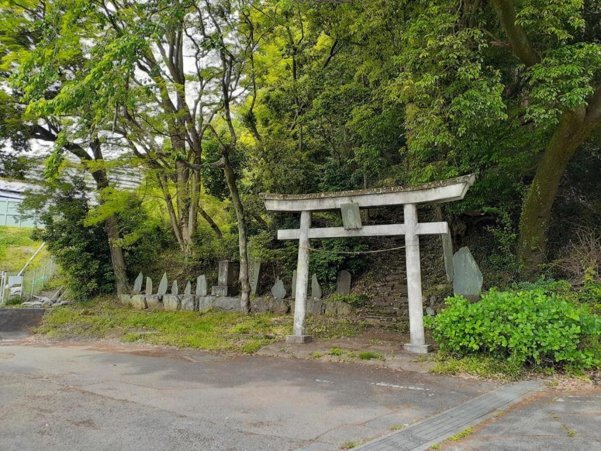 この境内に置かれている石板は「緑泥石片岩」であり、元々は、神社入口の用水路に架かる橋として使われていたものである。昭和58年頃の道路拡張工事に伴い、今ある場所に移して、ベンチとして利用されているという。