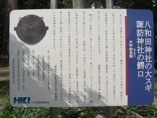 八幡神社の大ケヤキは、町の天然記念物に指定されている名木で、この木が下から水を吸い上げるため、この地の井戸はどんな日照りでも水がかれることがないと言われている。