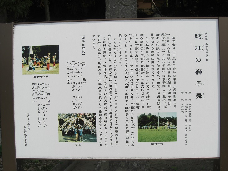 そして鳥居の左隣には「県指定 無形民俗文化財 越畑の獅子舞」の案内板がある。