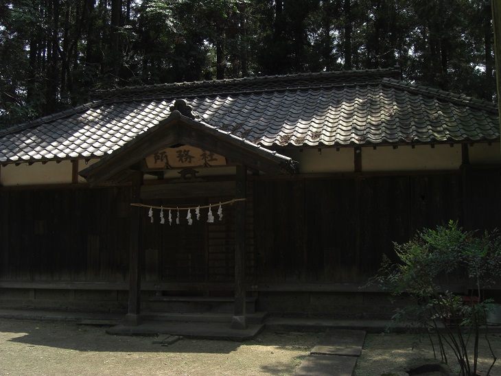 斜面を登りきると左側に神楽殿(写真左側)、右側に社務所(写真右側)がある。
