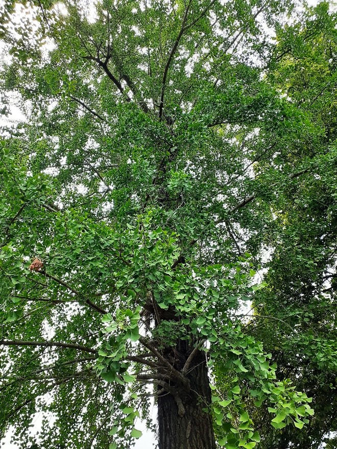 境内左側に聳え立つご神木の銀杏の木(写真左・右)