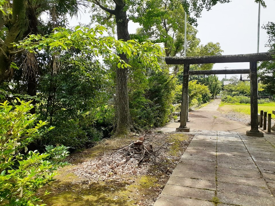 実のところ県道から左折して350m程進んだ民家の間の細い路地を右折すると、社の正面に到着できるのだが、その道は使わずに、その手前150m付近のT字路を右折して道なりに進む。左カーブ上になる農道を暫く進むと、社の後ろ側に到着し、そこの路肩を一時的にお借りして急ぎ参拝を開始した。