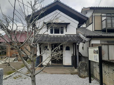 拝殿の右側に建つ白壁調の獅子舞道具庫 獅子舞道具庫の前に設置されている案内板