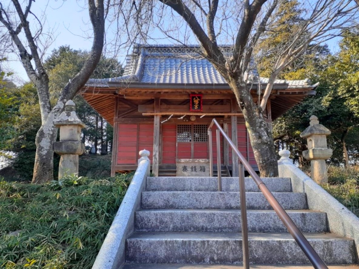 社殿奥の丘上に鎮座する 社殿の奥で丘上に鎮座する末社群