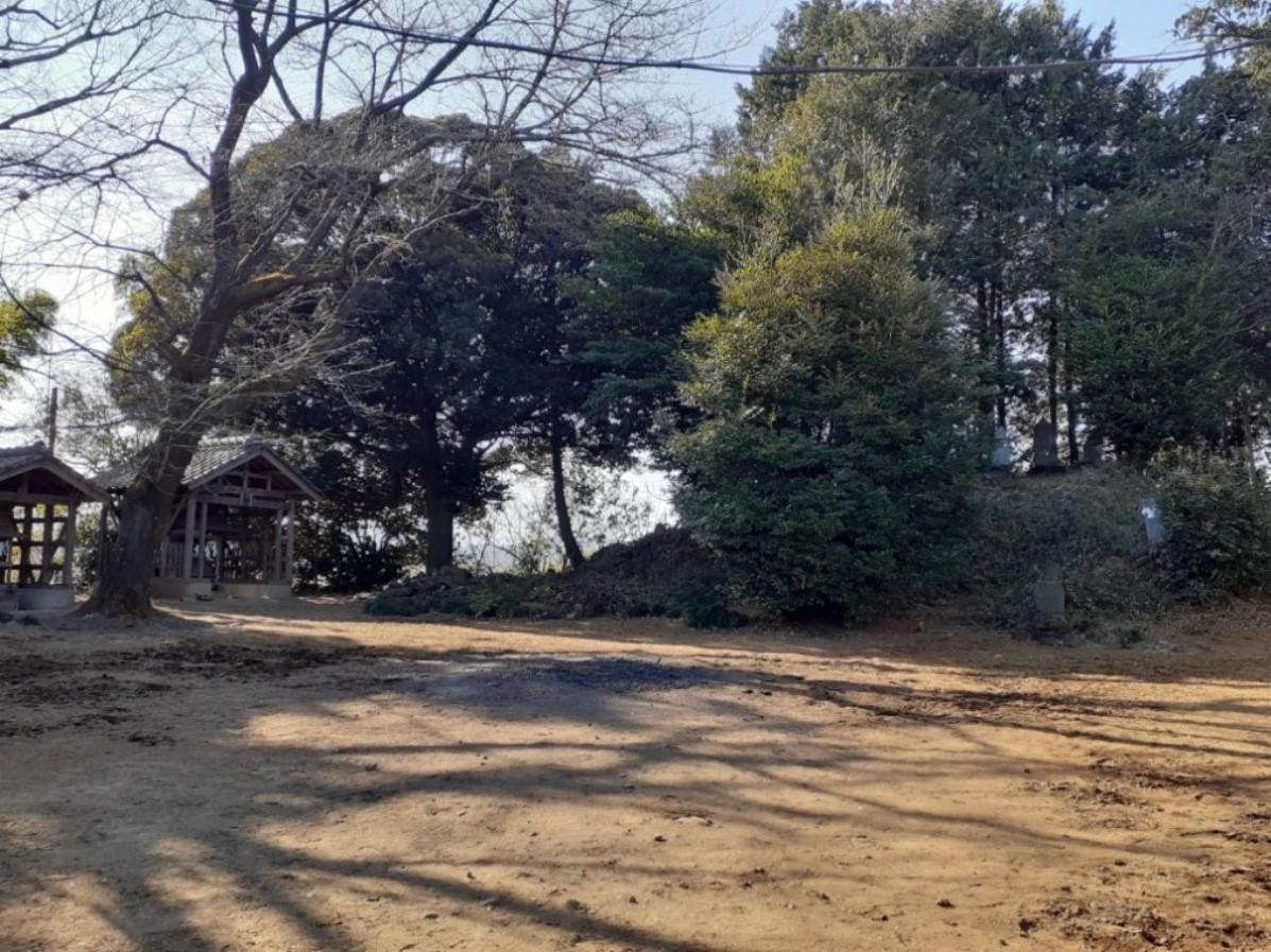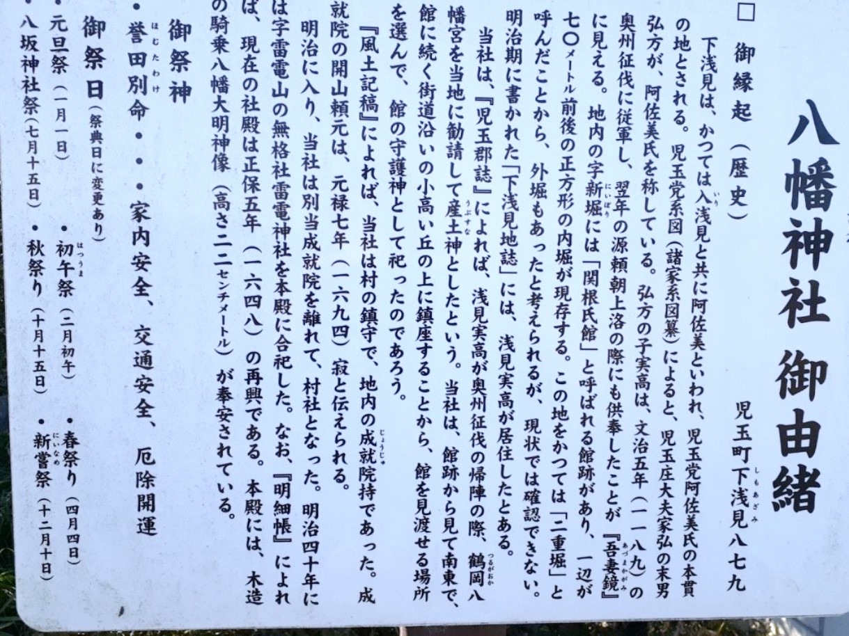 当社は、『児玉郡誌』によれば、浅見実高が奥州征伐の帰陣の際、鶴岡八幡宮を当地に勧請して産土神としたという。当社は、館跡から見て南東で、館に続く街道沿いの小高い丘の上に鎮座することから、館を見渡せる場所を選んで、館の守護神として祀ったのであろう。