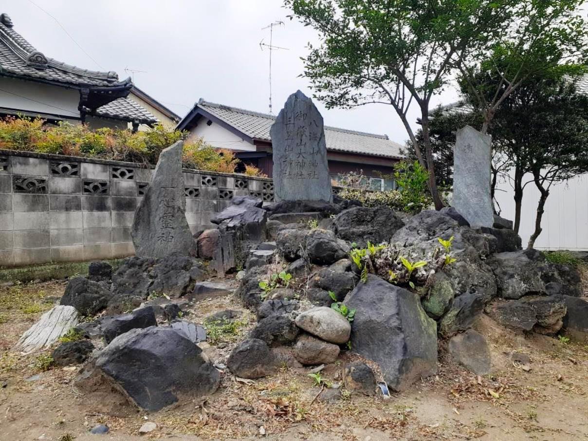 社殿の右側は幾多の境内社・石祠・石碑が並んで祀られている。不思議とその境内社・石祠群は、南北に通る道路に対して背を向けるように配置されて祀られている。