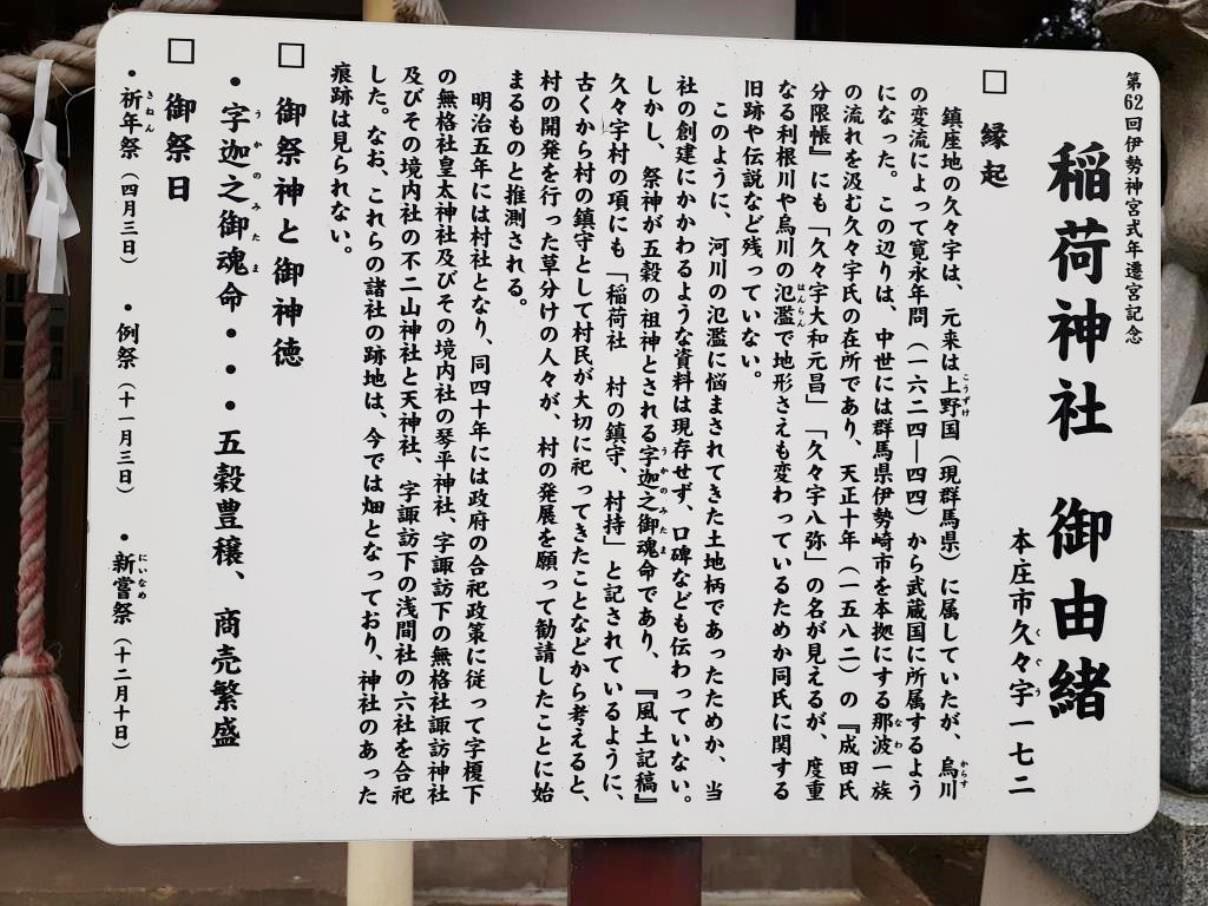 当村は元来、上野国に属していたと云われ、那波一族の流れを汲む、久々字氏の在所であり、天正十年(一五八二)の「成田分限帳」に「久々宇大和元昌」、「久々宇八弥」の名が記録されている。しかし、度重なる河川の氾濫に悩まされ寛永年間(一六二四~四四)に烏川変流により武蔵国に属することになったと云う。この様な状況から当社の創建年代は明らかではないが、祭神が「五穀の祖神」とされる「宇迦之御魂 」であり、古くから村の開拓を行った人々が五穀豊穣と村の発展を願って建立し、大切に祀ってきたと推測される。