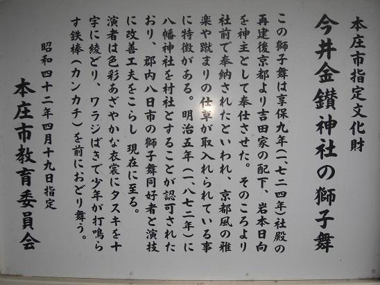 東側に向いている一の鳥居(写真上)の手前右側には本庄市指定文化財の「今井金鑚神社の獅子舞」の案内板(同左)がある。この獅子舞は 享保9年(1724)に社殿を再建したときに奉納したのがその始まりといわれます。京より招いた神官が伝えたといわれ、京風の雅楽や蹴鞠の仕草が取り入れられているという。また参道を真っ直ぐ進むと(同右)、社務所や社殿が右手側に見えるが、それらは参道に対して横を向いている配置となっている。