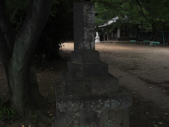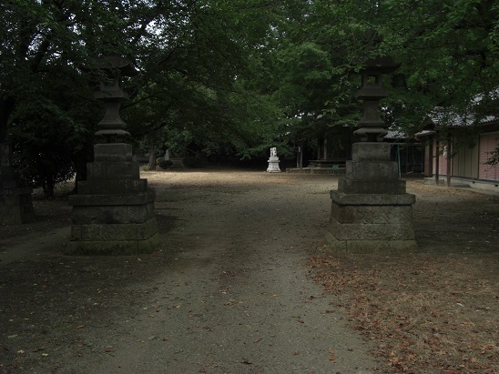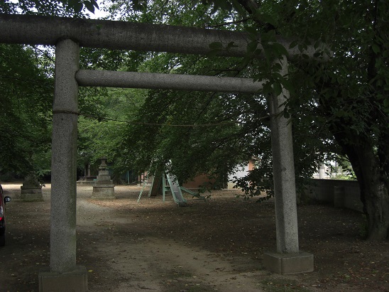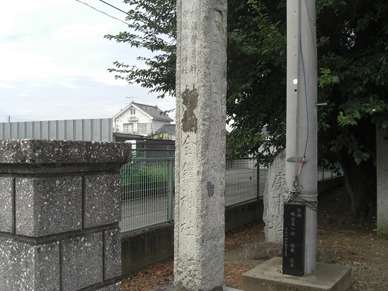 道路沿いで東側にある社号標石。この標石の奥には寛正年間(1789~1801年)の庚申塔。がある。また社号標石の奥に見える道路は、北廓遺跡という今井氏の居館跡と言われ、1982年の道路工事に伴う埋蔵文化財の発掘調査によって幅3.8m、深さ0.6から1.2mの直角の3条の堀が検出され遺物も出土しているとのことだ。現在は道路や駐車場となっていて当時の面影はまったくない。